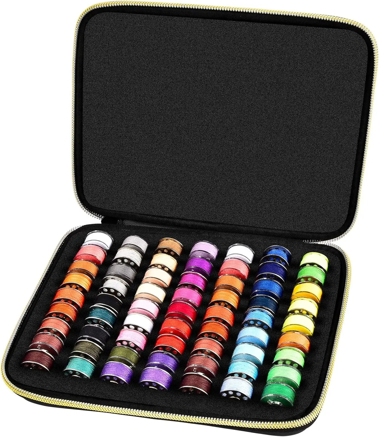 63-slot bobbin case holder for organizing bobbins and threads. Keeps spools neatly stored and compatible with Brother, Singer, Babylock, and other standard sewing machines. Perfect for sewing enthusiasts and craft rooms.