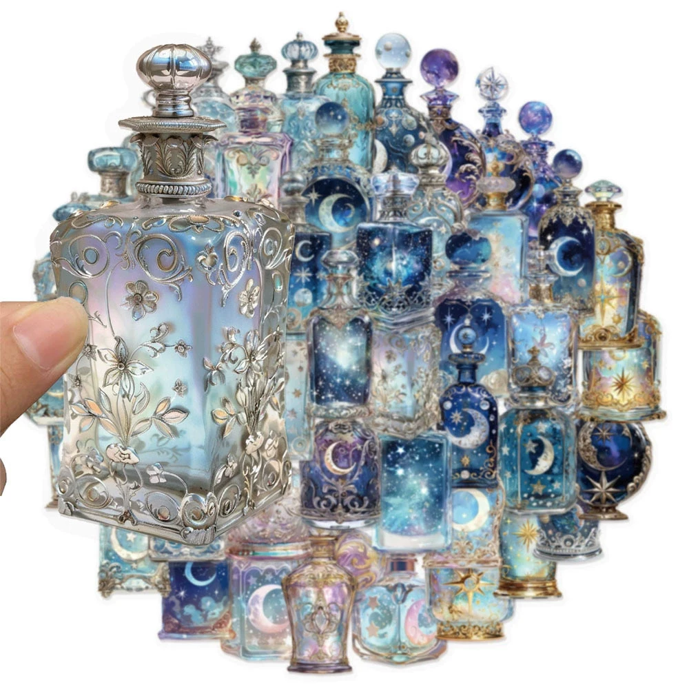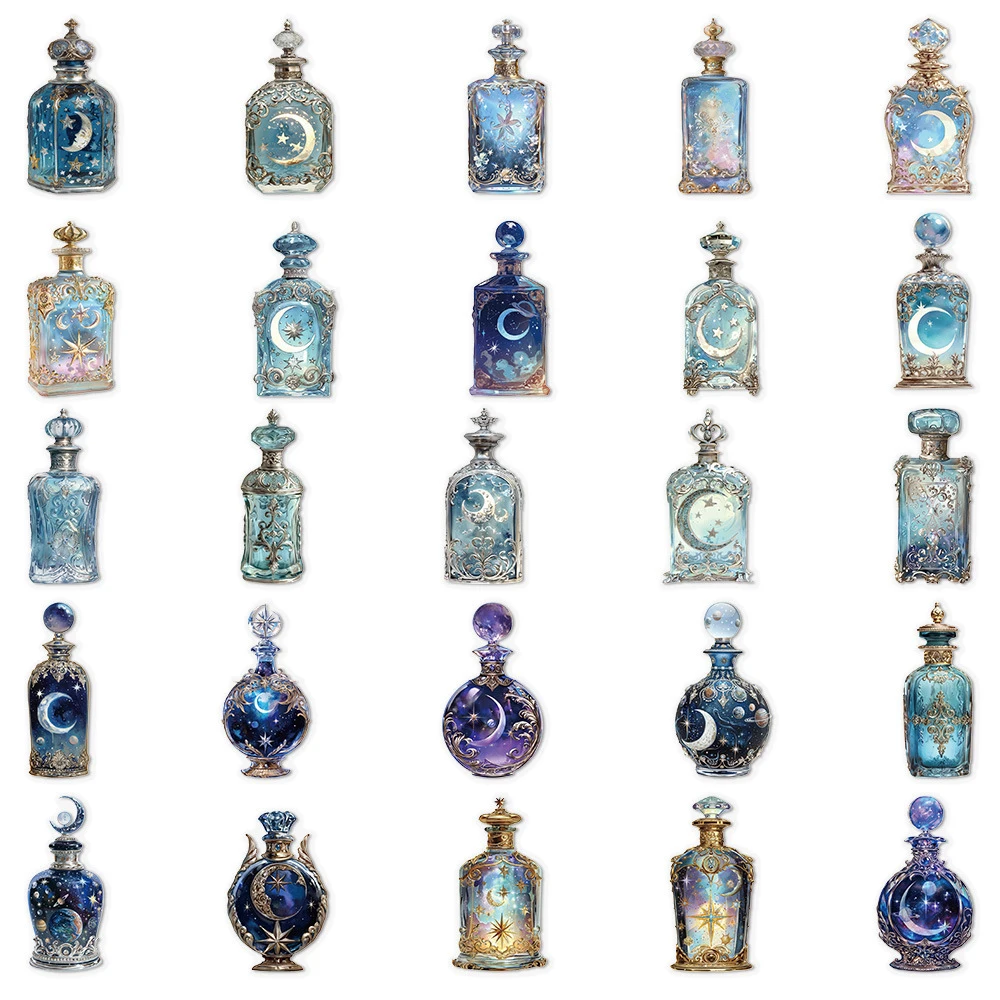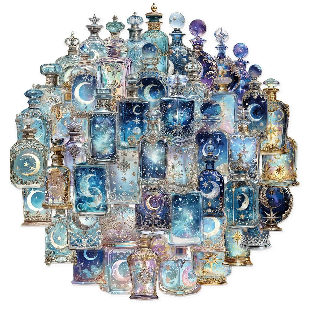 Universe galaxy moon phase bottle stickers made from transparent PET material. Available in 10/30/50-piece sets, perfect for decorating bottles, luggage, notebooks, phones, and more. Aesthetic, waterproof, and easy to apply.