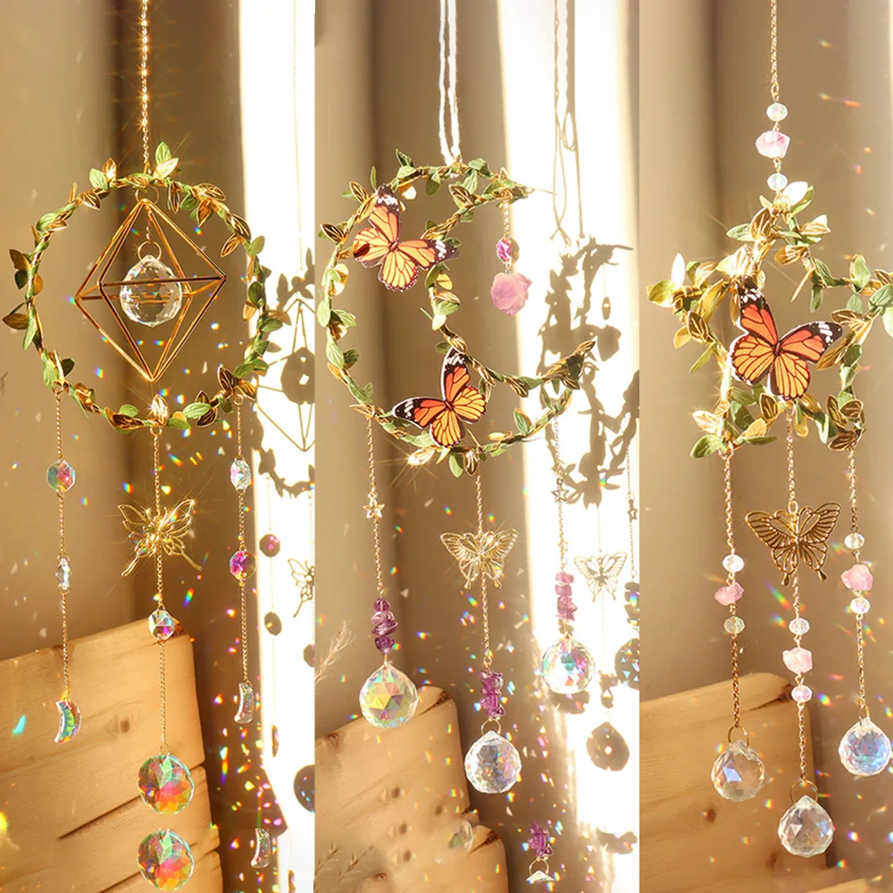 Crystal sun catcher wind chime featuring star, moon, heart, and diamond prisms. Beautiful hanging light catcher that reflects sunlight into sparkling drops. Perfect for home décor, windows, or thoughtful gifts.