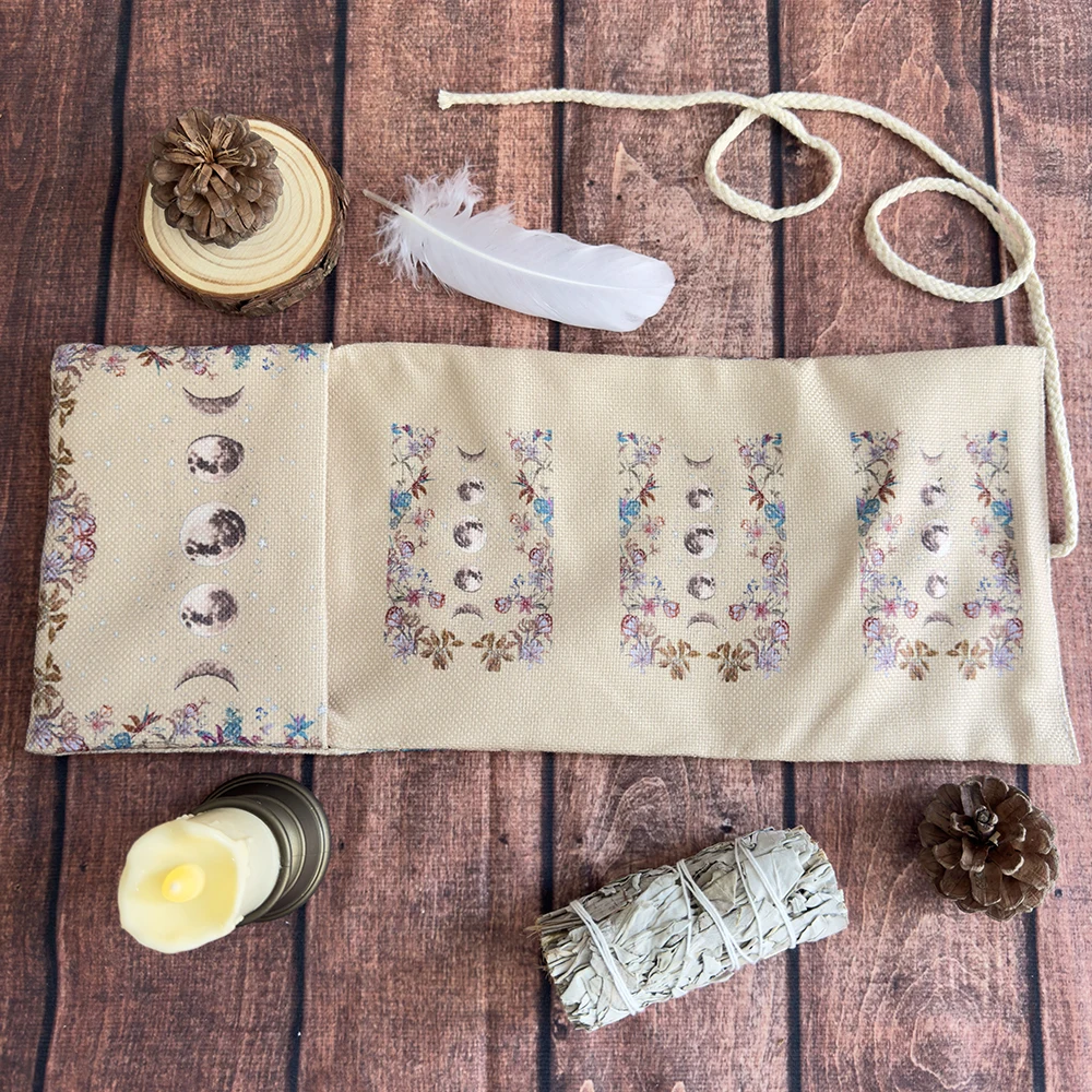 Lunar phase tarot card storage pouch with celestial floral moon design. Perfect for storing tarot cards, divination tools, or small mystical items. Can also double as a decorative tablecloth for readings or rituals.